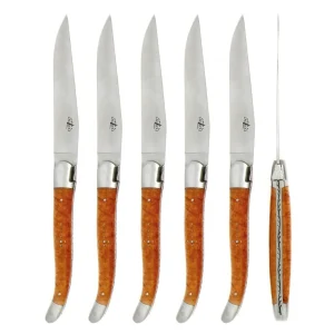 Forge De Laguiole set of 6 Steak Knives: Karelian Birch Handle Satin Finish