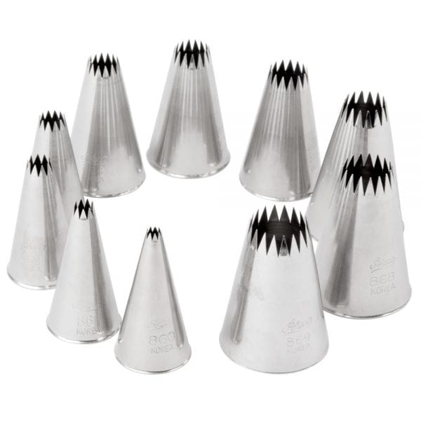Add fine, deeply-grooved icing patterns on your cakes, cupcakes, pies, and more with this Ateco 870 10-piece french star pastry tube decorating set. Made of durable stainless steel, each tube is rust-resistant and designed to withstand repeated use without bending out of shape. Featuring one tube of each size, #0 through #9, ranging in width from 5/32″ to 11/16″, this set gives you versatile usage and size variation in your icing decorating. You can create can create shells, stars, flowers, and scalloped designs. Using the right sized pastry tube for the job will enhance your presentation to draw patrons’ attention to your display cases and plated desserts.