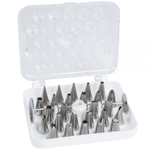 Take your pastry decorating to a whole new level with this Ateco (August Thomsen) 782 29-piece stainless steel pastry tube decorating set! Whether you are adding the final touches to a cake or topping off your custom cupcakes, this set gives you everything you need to create your signature designs. Plus, it all fits in an included hinged, plastic box for convenient storage.