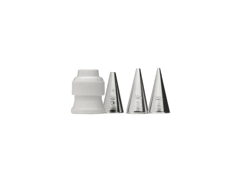 Take your pastry decorating to a whole new level with this Ateco 380 4-piece stainless steel writing piping tip decorating set! Whether you are topping off your custom cupcakes or adding the final touches to a cake, this set gives you everything you need to create your signature designs.