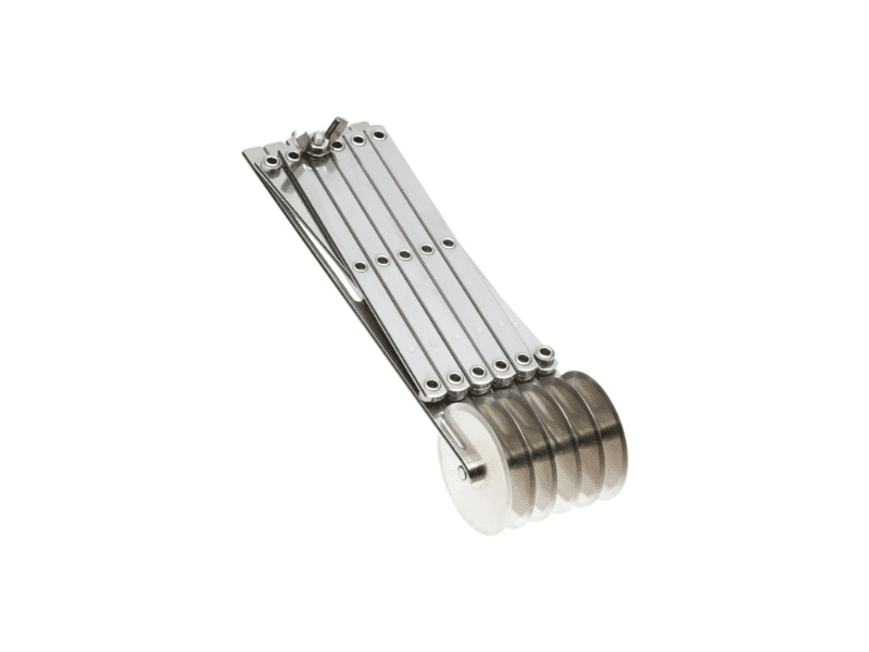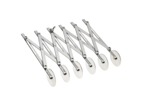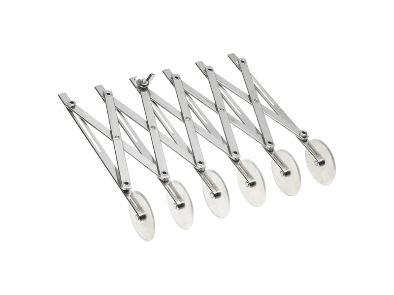 All Ateco multi-wheel cutters feature a locking device to insure even cuts and uniform portions. To use, loosen wing nut and adjust outer rods until the wheels are at the desired spacing. Then tighten wing nut. Opens to 4 .9″ between wheels.