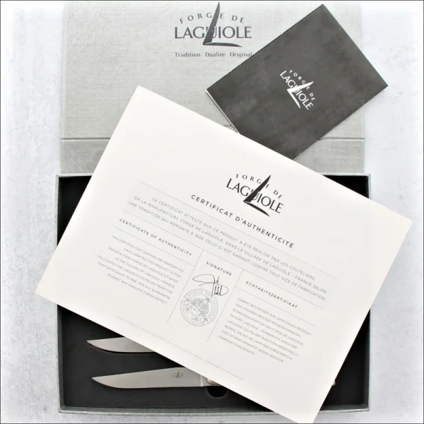 This steak knife set was entirely hand made in the village of Laguiole. Forge de Laguiole knives are truly and by far of the highest quality offered in the market today. Additionally, each one of this master piece is entirely handmade by the same craftsman to ensure pride in the completed piece. The Forge de Laguiole workshop is located in the tiny village of Laguiole, France – Pop. 1300 – where the Laguiole knife first appeared in the early 1800s.