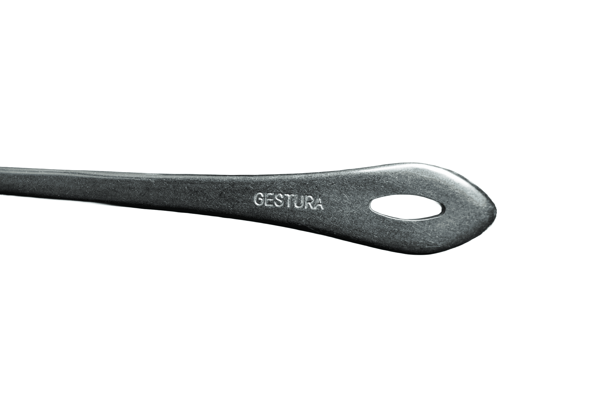 Inspired by the worn and tarnished steel often found at flea markets, and modeled after old American and European silhouettes the spoon is tumbled and unpolished. This creates a matte and imperfect material finish. Each piece is stamped and etched, then finished by hand on a lathe in Mr. Okada’s workshop.