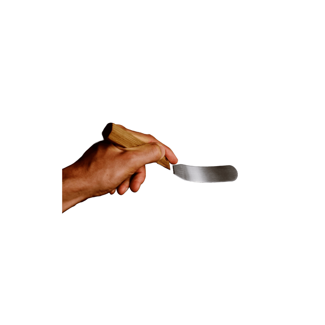 Beautiful Japanese oak and a heat treated flex steel that can bend and snap back in place. It was important to us that no resins, glues, or plastics were used to fix the blade to the handle, so all you will find is two rivets and a piece of wood lightly treated with some walnut oil