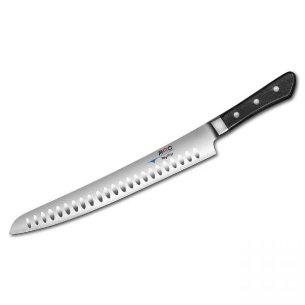 The long, narrow blade produces thin, even slices with ease and the curved blade shape allows the knife to fall through tender meats very quickly. The added dimples reduce drag which further allows this knife to cut through most proteins with little effort.