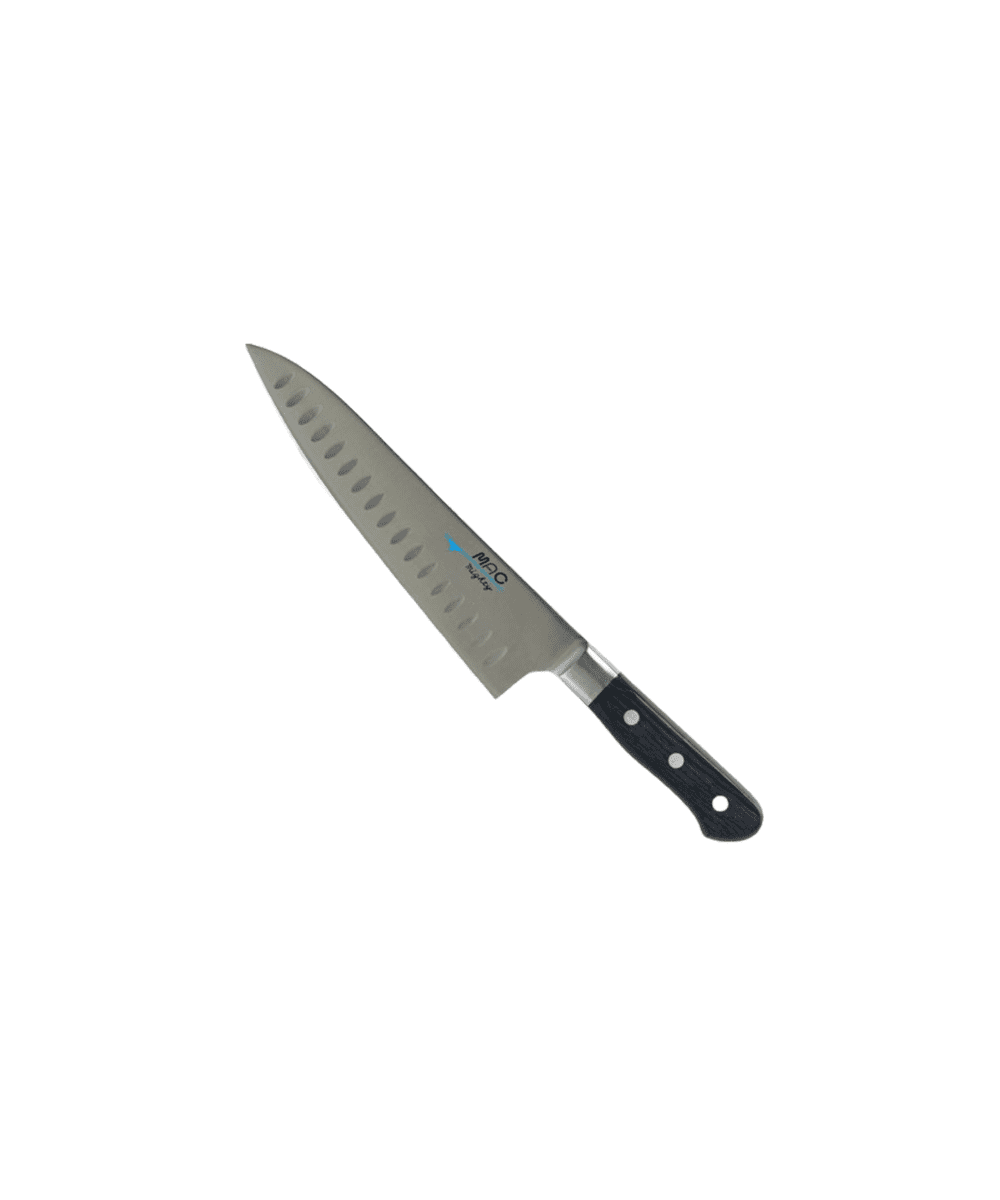 The 8-in. length is the most commonly used size in both the home and professional kitchen. With standard features of our Professional series, the thin 2.0mm blade and bolster allows this knife to easily cut, slice, and dice almost any food. The added dimples help the knife to glide through sticky foods such as potatoes, apples, and summer squash.