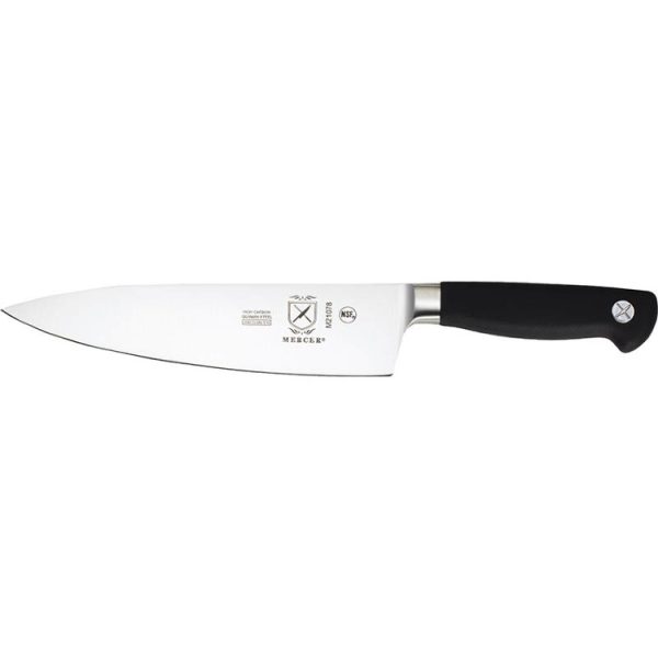 Culinary students and professionals alike will delight at the superior cutting ability of this Mercer M21078 Genesis 8″ chef knife! Forged from high-carbon German steel, this all-purpose kitchen knife provides strength, durability, and balance. The blade edge, sharpened at a 15 degree angle, allows this knife to slice, chop, dice, and mince its way through a large variety of vegetables, fruits, meats, cheeses and other ingredients with precision and ease. Plus, its short bolster allows the user to choke up on the blade for better control, and it allows for the blade to be fully sharpened down to the heel. Complete with a black, Santoprene handle, this knife will allow any chef to prepare delicious meals safely and efficiently! NSF Listed.