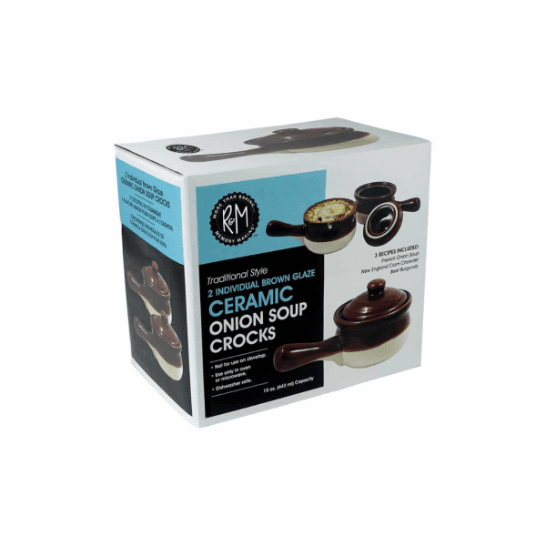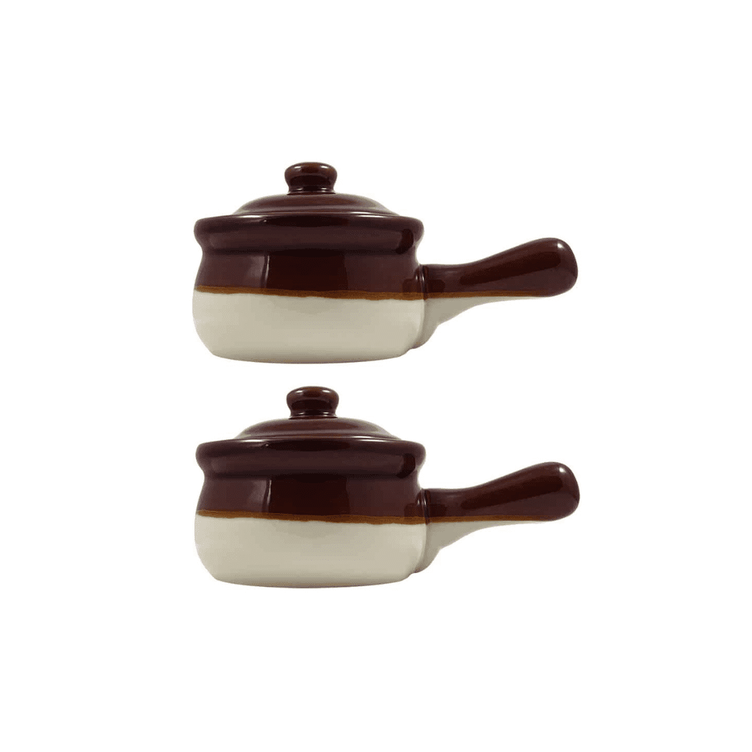 From oven to table, this 2-piece set of ceramic onion soup crocks are perfect for serving flavorful soups and stews to family and guests. Durable ceramic. Oven, microwave and dishwasher safe.