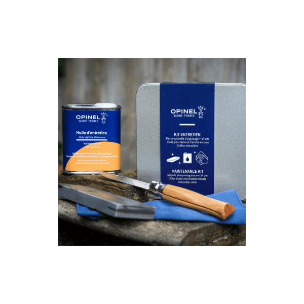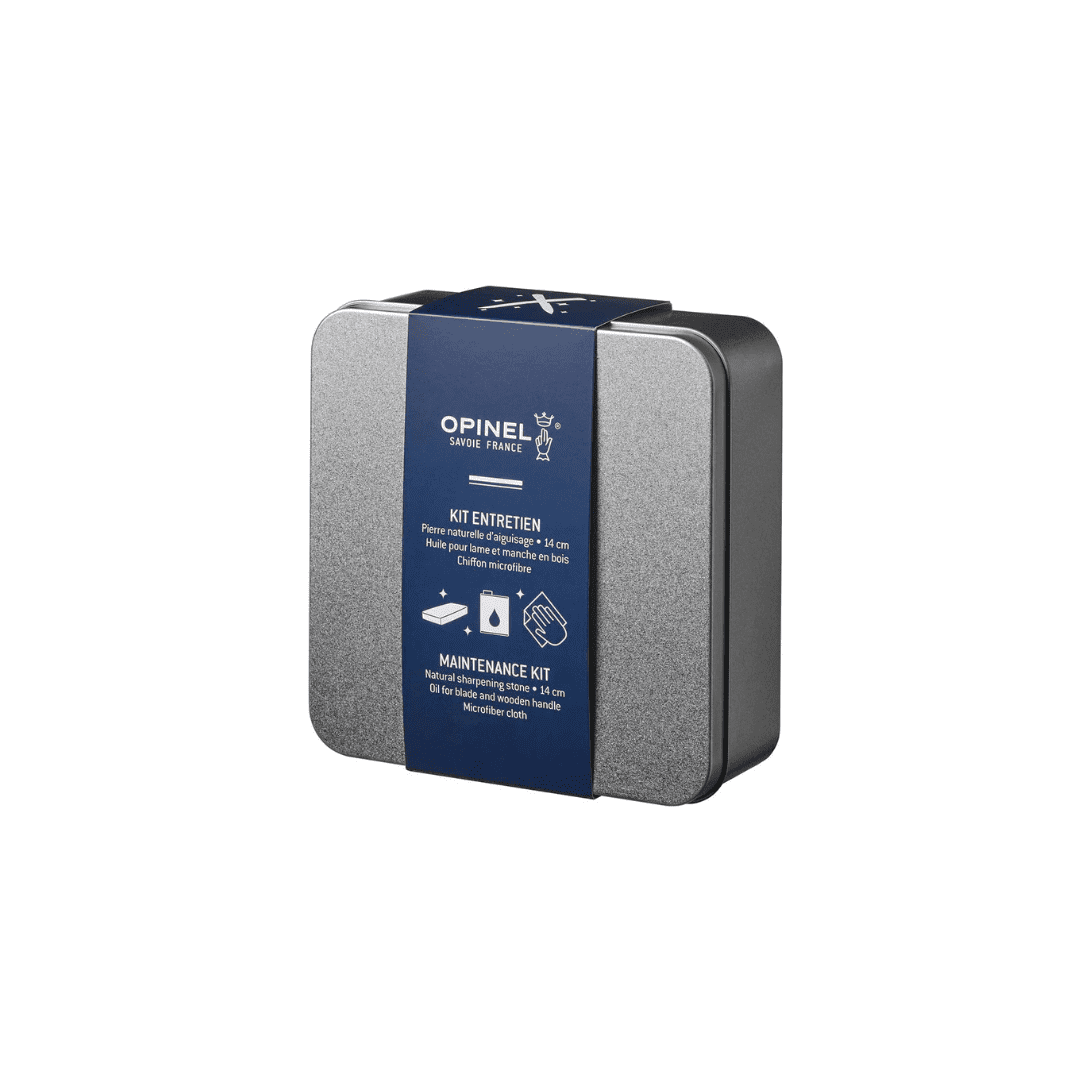 Nestled into a metal storage box, the Maintenance Kit contains a 5.5 inch sharpening stone, a 5oz can of plant-based oil, and a microfiber cloth all used in tandem to maintain and prolong the life of your Opinel knife.