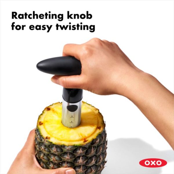 Simply slice off the top of a fresh pineapple, then twist the Slicer onto the exposed fruit to create perfect pineapple rings. Ratcheting handle is easy on arms and wrists. Measurement markings let you gauge a pineapple’s height before slicing so you know when you’re nearing the bottom of the fruit.