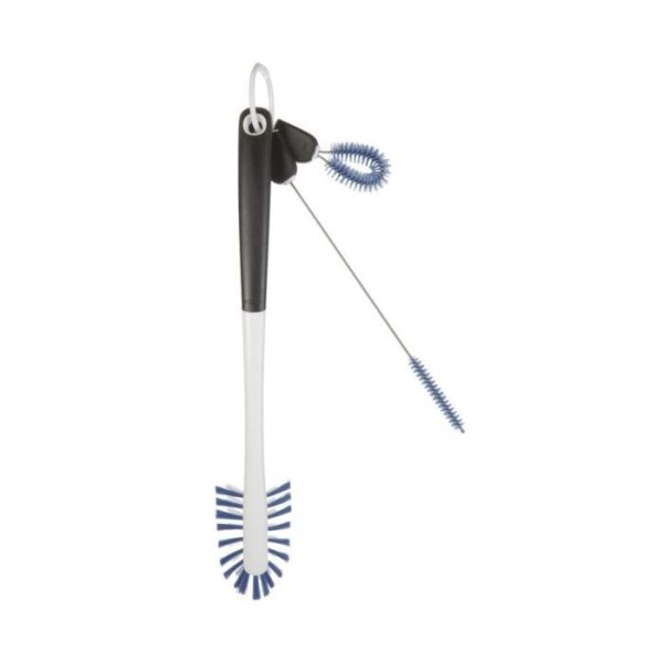 The Set includes a long bottle brush, great for cleaning inside bottles; a straw brush, which easily gets inside sports bottle straws; and a detail cleaner, which gets into the crevices of caps and lids. All three have durable nylon bristles. They store together on a handy ring and snap off for use.