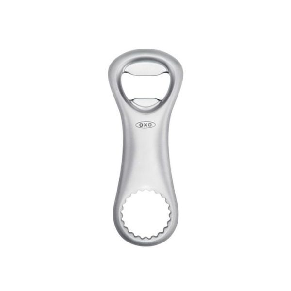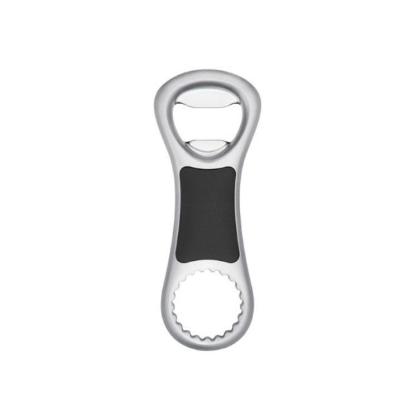 The Die-Cast Bottle Opener opens pop-top and twist-top beer and soda bottles with ease. The pop-top side opens metal caps with a flick of the wrist, and the twist-top side grips onto metal bottle cap teeth for effortless opening.