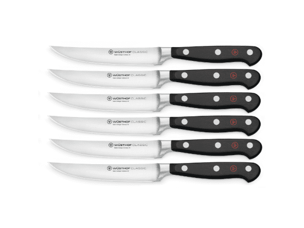 The iconic WÜSTHOF Classic Steak Knife is, like anything and everything WÜSTHOF, forged in a centuries-old global destination for knife artisanship: Solingen, Germany. The extra-sharp blade cuts perfectly through your favorite meat and vegetable dishes and compliments any table setting beautifully. Each Classic steak knife is forged from a single piece of specially tempered, high-carbon steel and precision-sharpened to stay sharp for longer. The elegant handle is triple riveted and equipped with a full tang for superior safety and durability. The WÜSTHOF Classic 6-piece Steak Knife set includes six (6) Classic 4 1/2″ Steak Knives.
