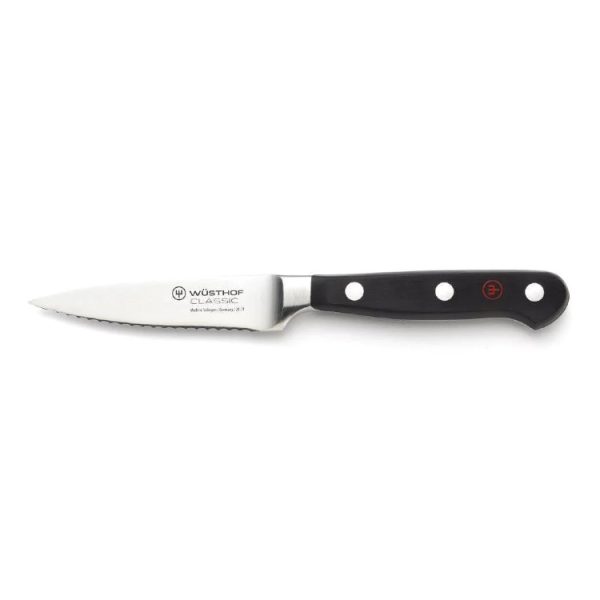 The Classic 3 1/2″ Fully-Serrated Paring Knife is the second most important knife to have in the kitchen. The small narrow blade tapers to a point at the tip and is easy to handle making it the perfect knife to trim and slice and peel small produce such as garlic cloves and herbs. The added serrated edge has saw-like teeth that enable the blade to slice cleanly through food with delicate textures such as bread or soft vegetables and fruit.